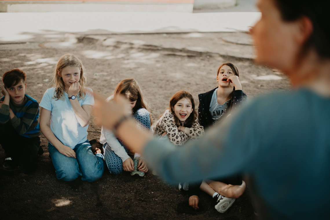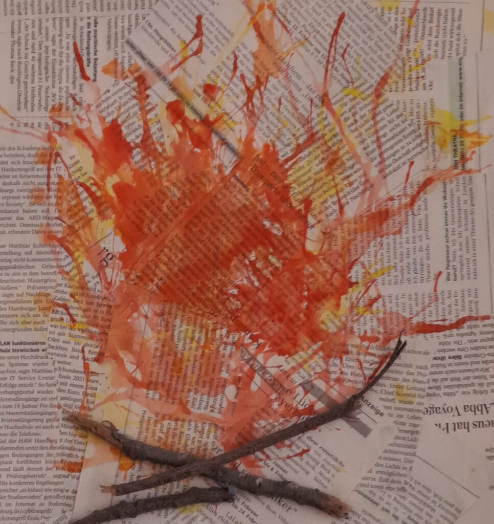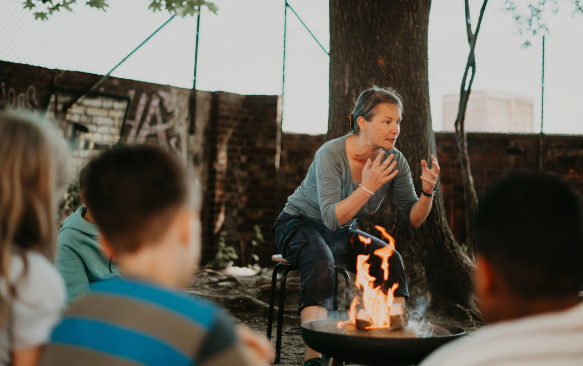 In einer Feuerschale macht sie auf dem Schulhof ein Lagerfeuer und erzählt gemeinsam mit Kindern einer 3. oder 4. Klasse eine Geschichte vom Feuer.