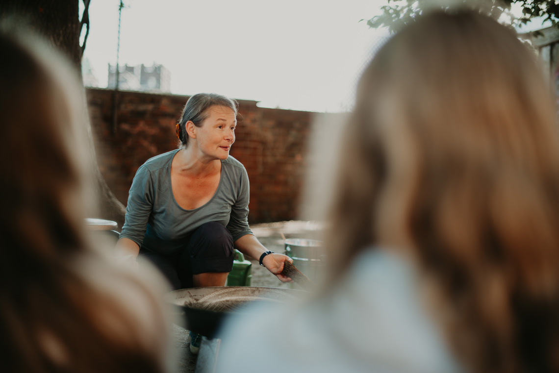 In einer Feuerschale macht sie auf dem Schulhof ein Lagerfeuer und erzählt gemeinsam mit Kindern einer 3. oder 4. Klasse eine Geschichte vom Feuer.