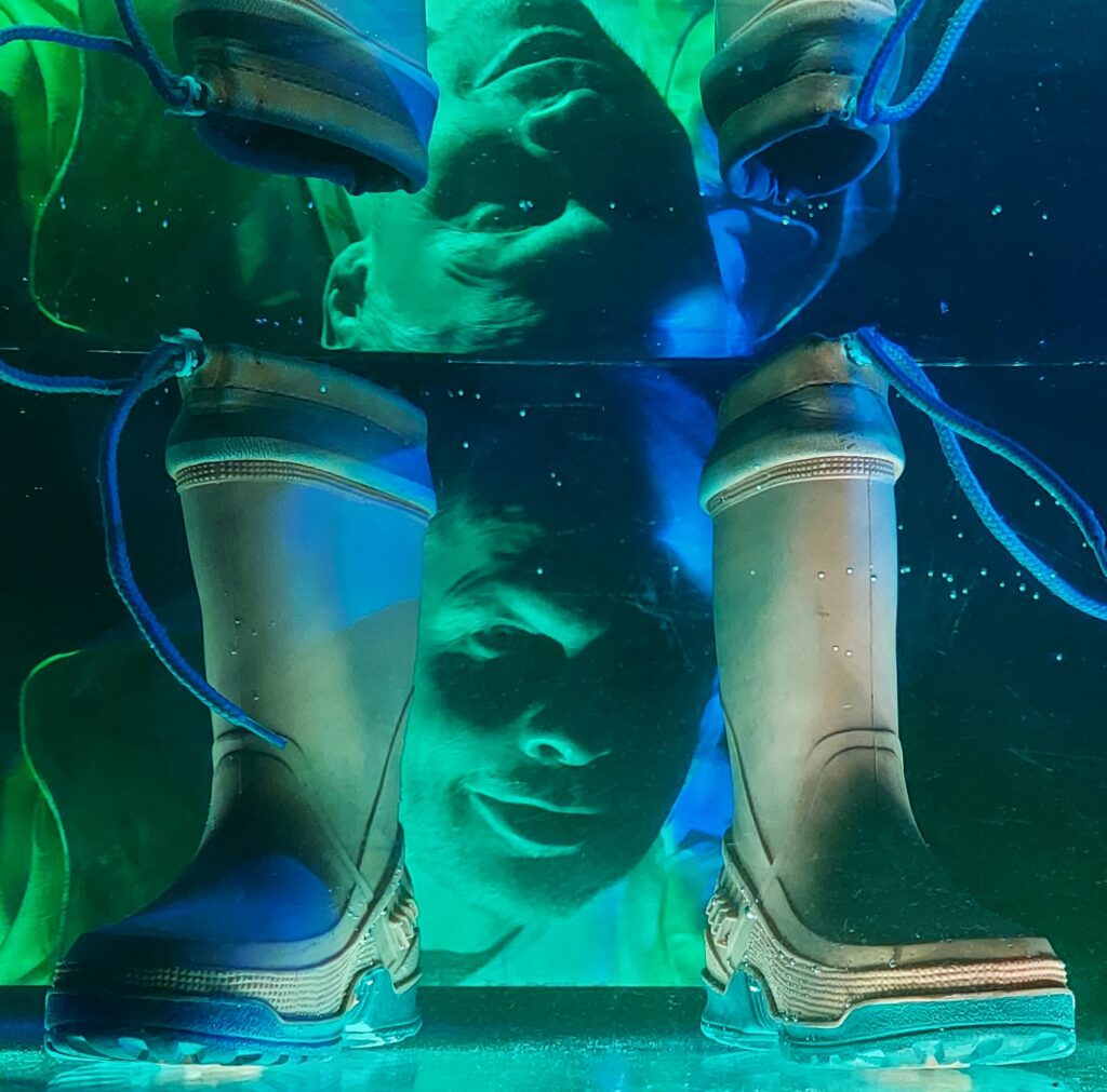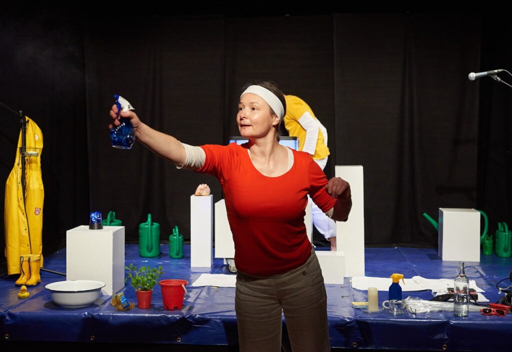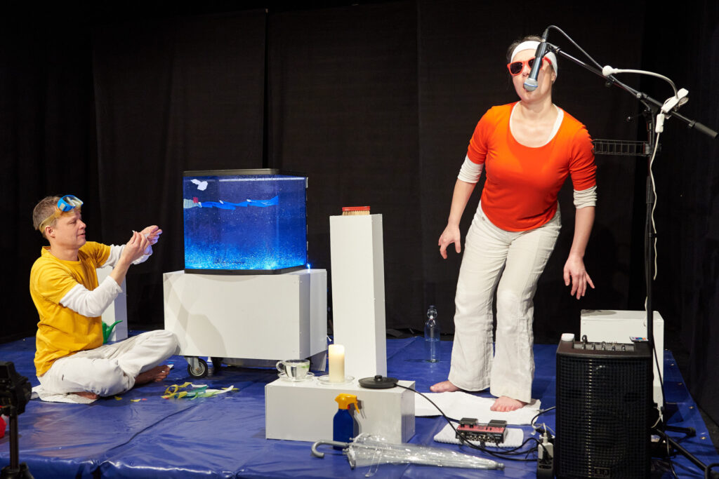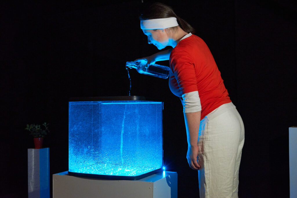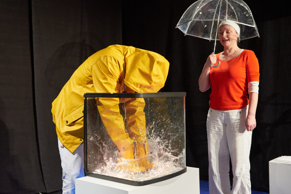 Wir alle kennen Wasser. Vom Trinken und vom Waschen, von Wellen und aus Wolken, als Nebel oder Eis. Aber kann Wasser sprechen? Kann es uns Hoffnung machen oder Angst? Mit unserem Publikum begeben wir uns auf eine poetische und platschende Suche, was Wasser alles ist und was Wasser alles kann. Mit traumhaften Bildern, handgeschöpfter Musik und einem großen Aquarium gehen wir auf Tauchfahrt, springen in Tiefsee-Pfützen und lauschen bunten Tropf-Konzerten. Wir bringen ein Aquarium mit und füllen es nach und nach mit Wasser. Zunächst können kleine Gummistiefel darin in einer Pfütze tanzen, dann schwimmt ein Papierboot über die Wasseroberfläche und schließlich sind da fremde Wesen in einer Unterwasserwelt.